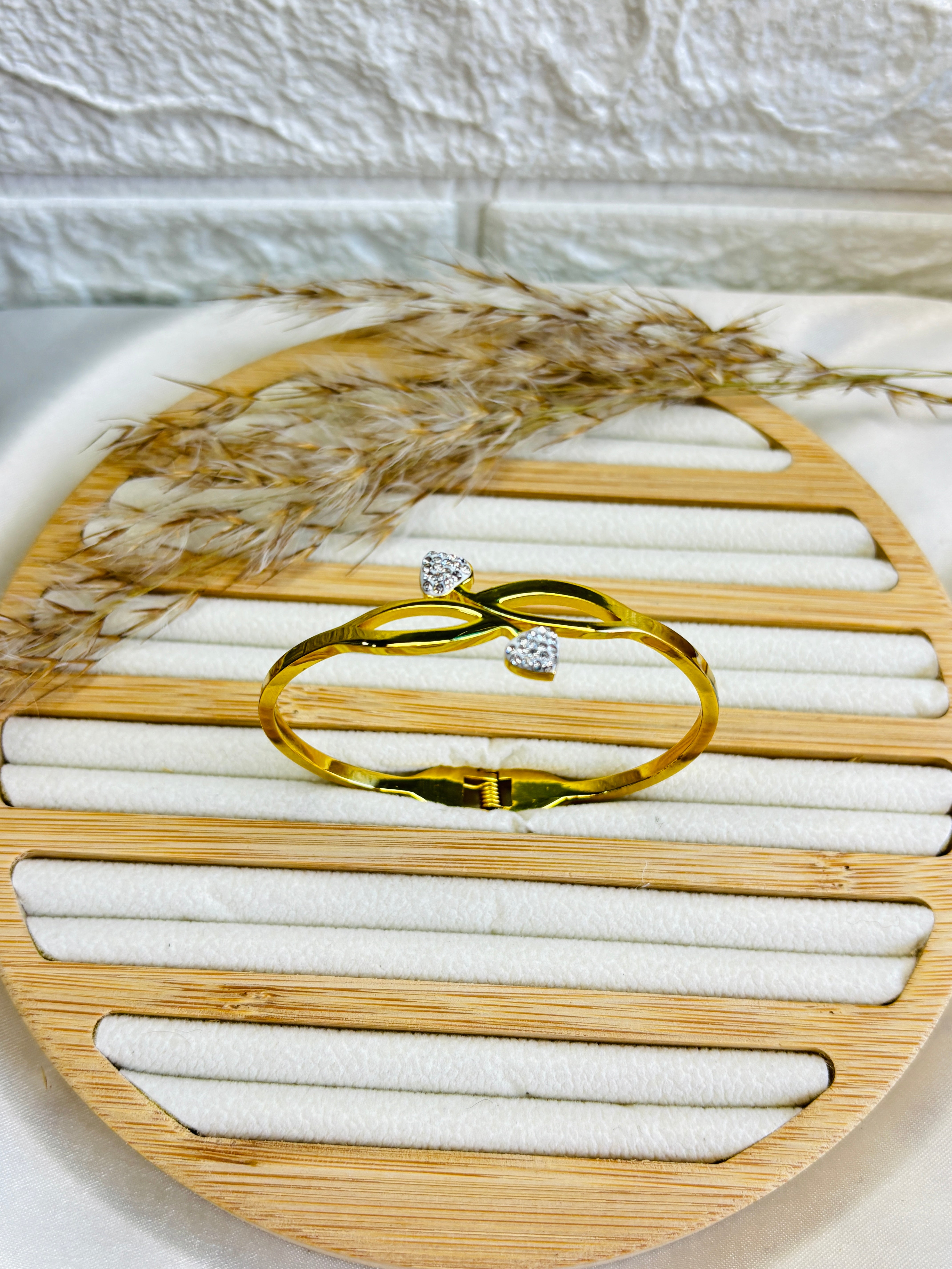 The Twin Love Bracelet features a sleek gold band with twin heart detailing, symbolising connection and balance.
