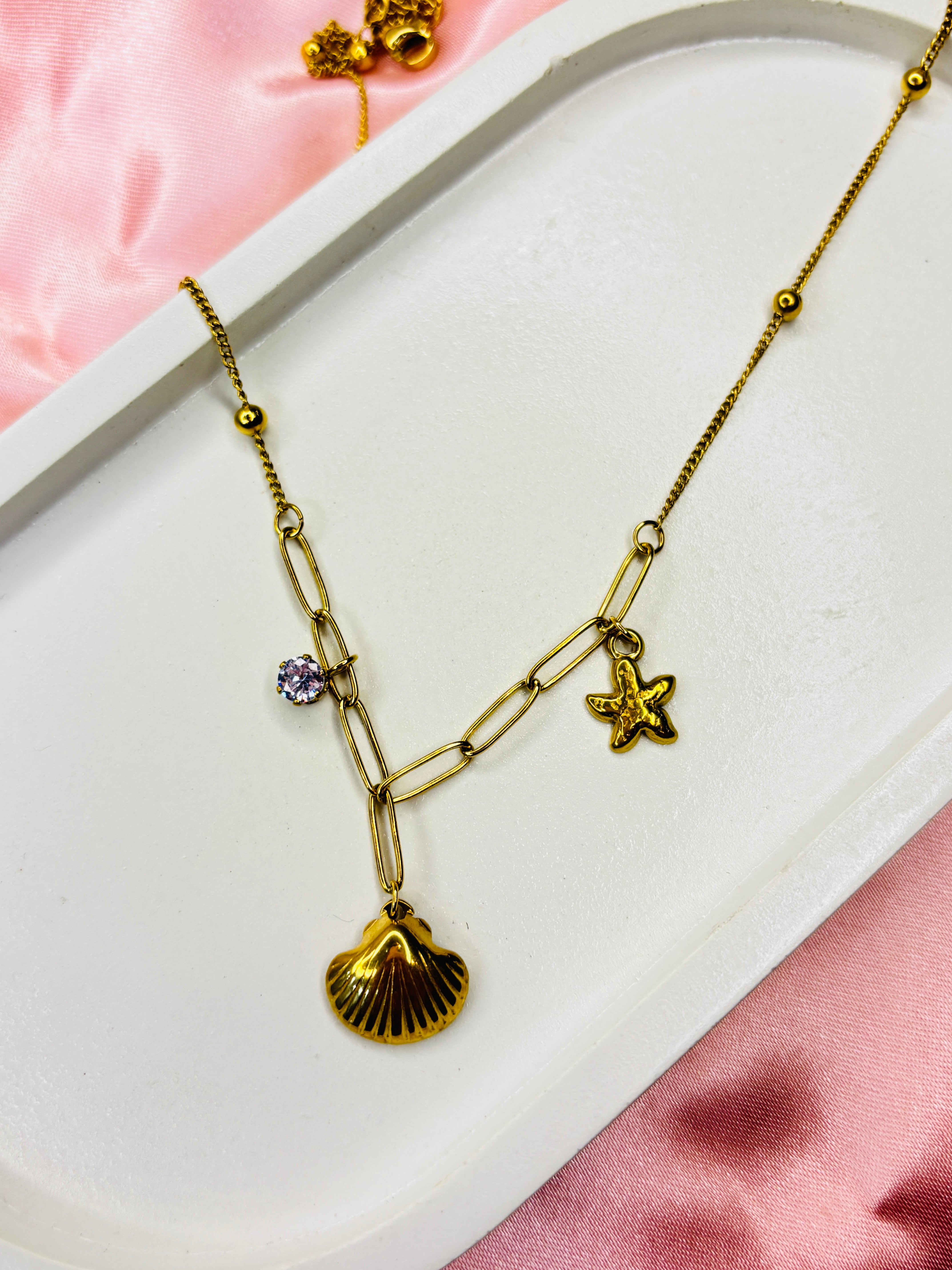 Bring soft ocean elegance to your everyday look with our StarShell Charm Necklace. Designed with a delicate chain, sparkling crystal drop, playful star charm and golden seashell pendant β this piece captures the calm beauty of waves and sunsets.